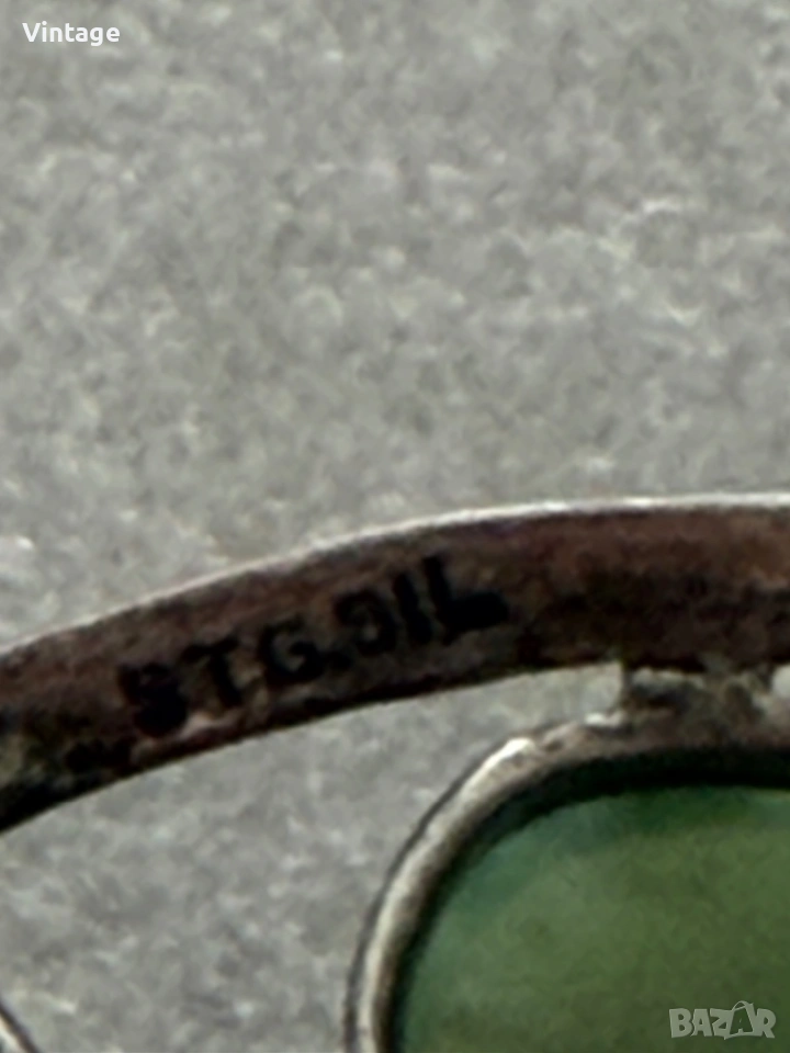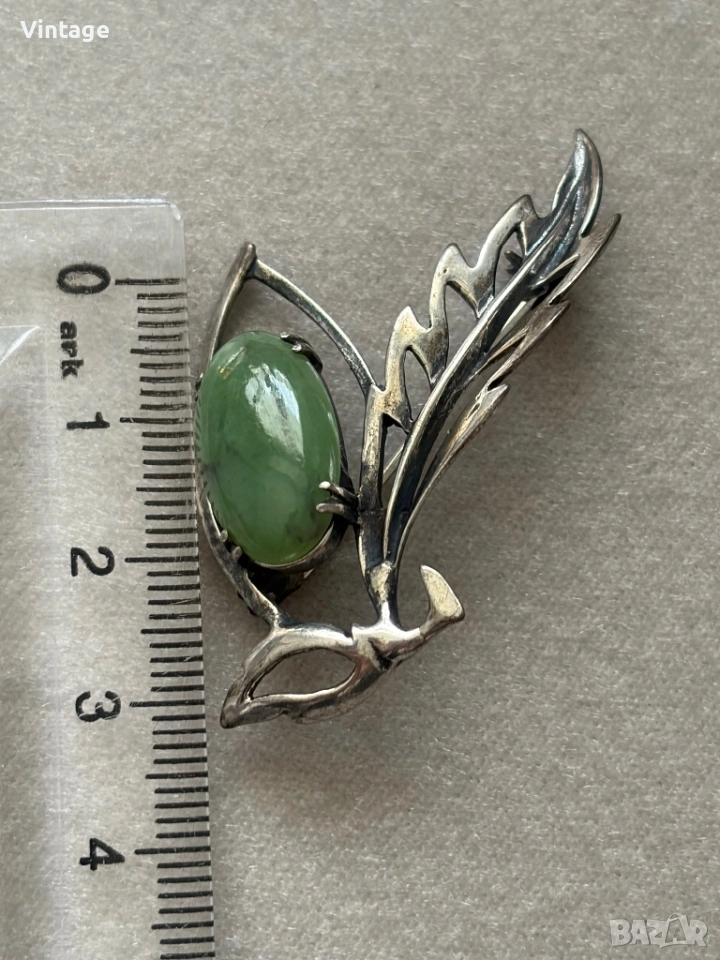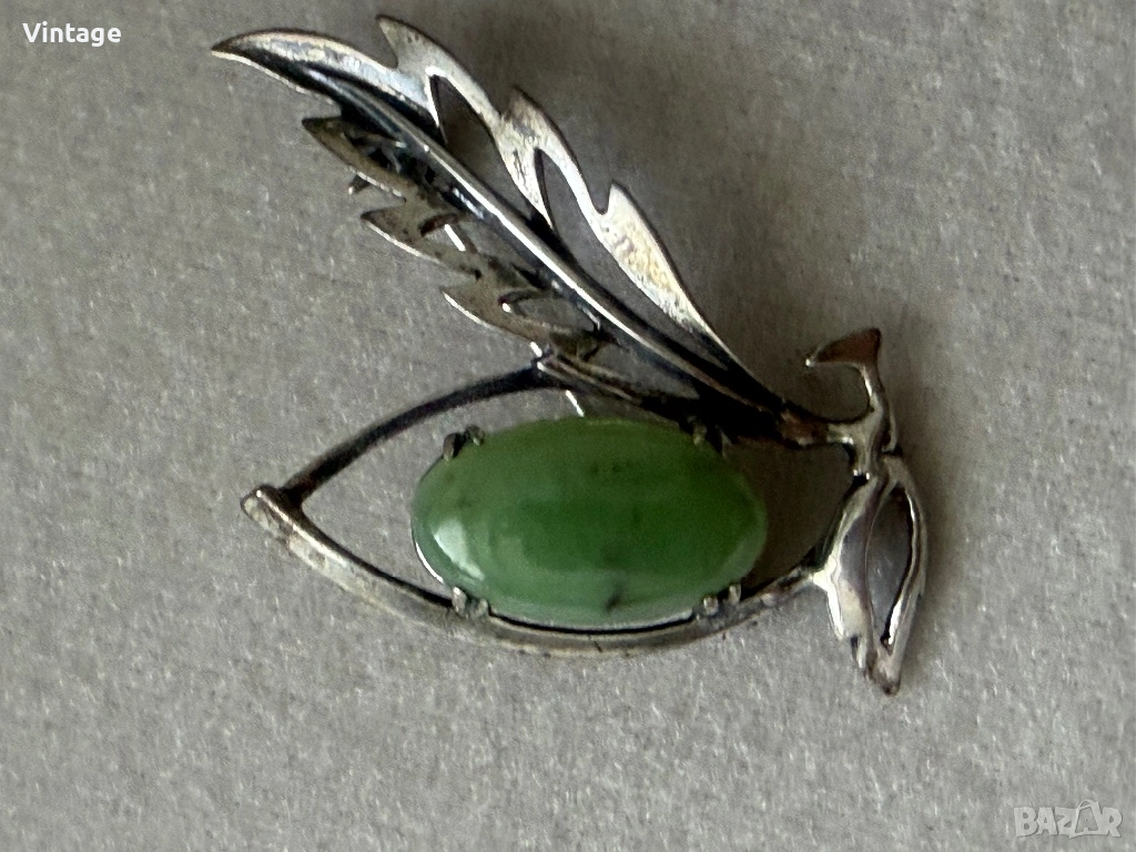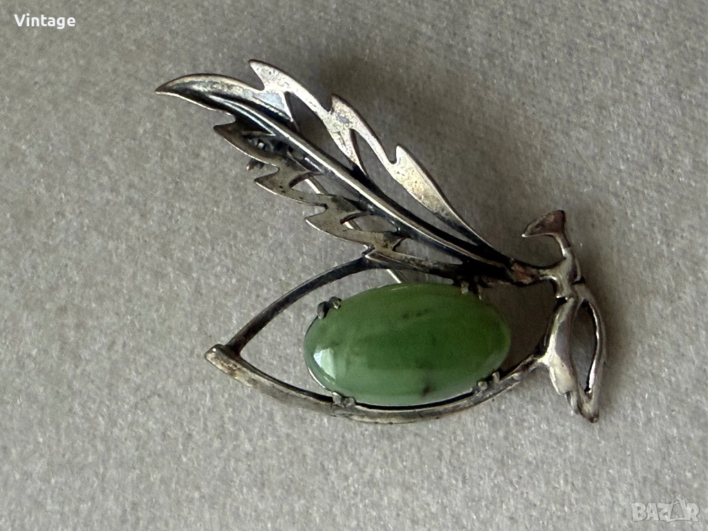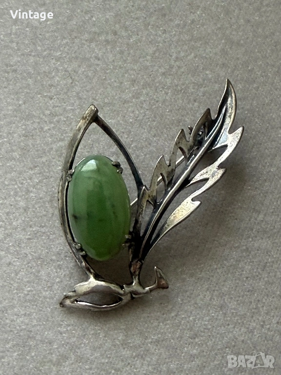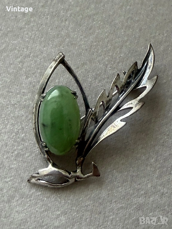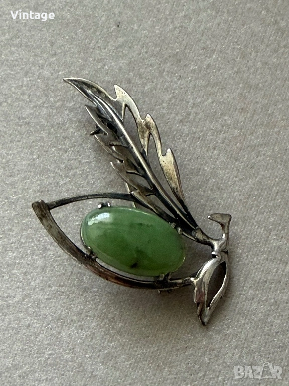 Старинна сребърна брошка с естествен рядък камък Нефрит → Обява 54223525