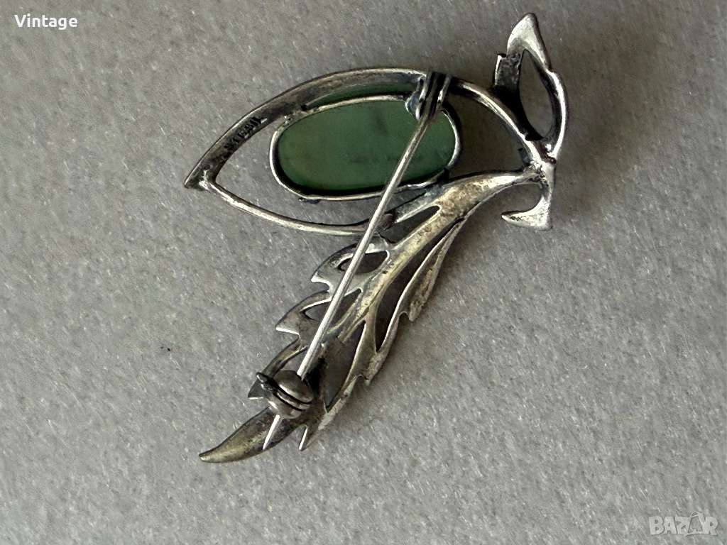 Старинна сребърна брошка с Нефрит - рядък естествен камък. Брошката е уникална, изработена от sterling сребро с маркировки. Размери 3см/4см /2,5см тегло 6гр. Отлично състояние.