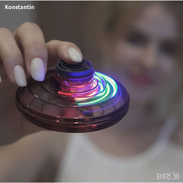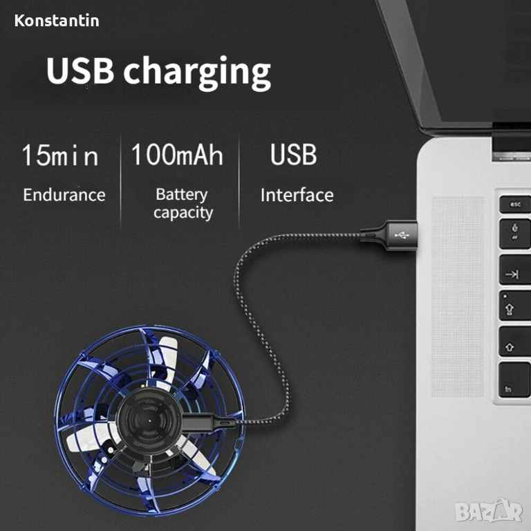 Летящ спинер с батерия / USB зареждане. С този удивителен Летящ спинер вече няма нужда да се притеснявате за батерии. Снабден с вградена батерия, той може да работи часове наред след кратко зареждане. Просто свържете го към USB порт и сте готови за дълги часове на забавление. ✈️ Летящо изживяване: Този умопомрачителен спинер може да лети във въздуха, като се предоставя на вашите очи изумително летящо представление. Нещо магично, което може да ви завладее и зачарова.