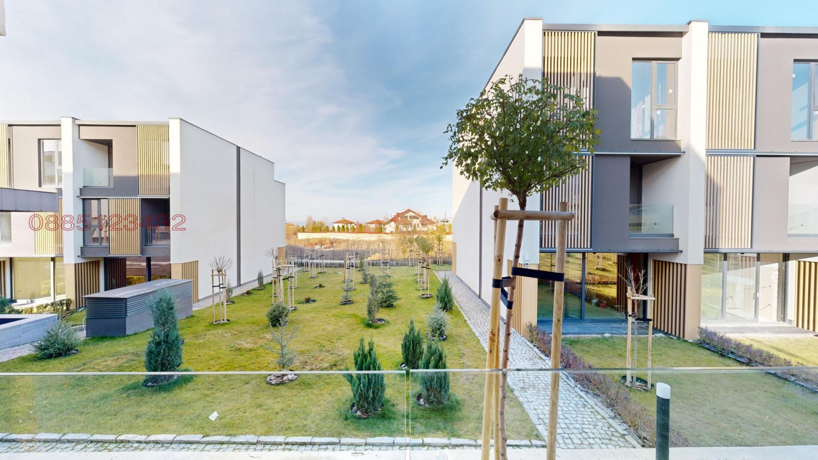 Къщите се намират в район с ниско застрояване на тиха и спокойна улица с гледки към планината и частични гледки към София.
