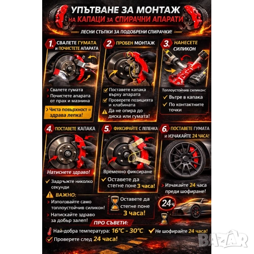 Важно: Преди покупка измерете вашите спирачни апарати – капаците трябва да са поне с 1 см по-големи за правилен монтаж.