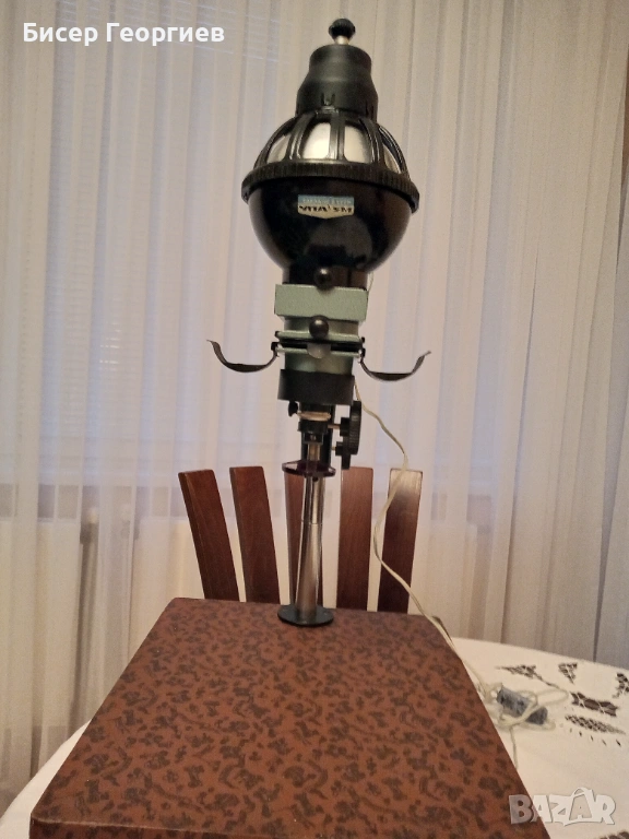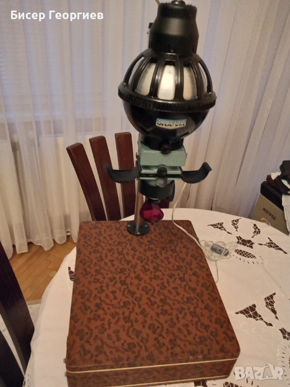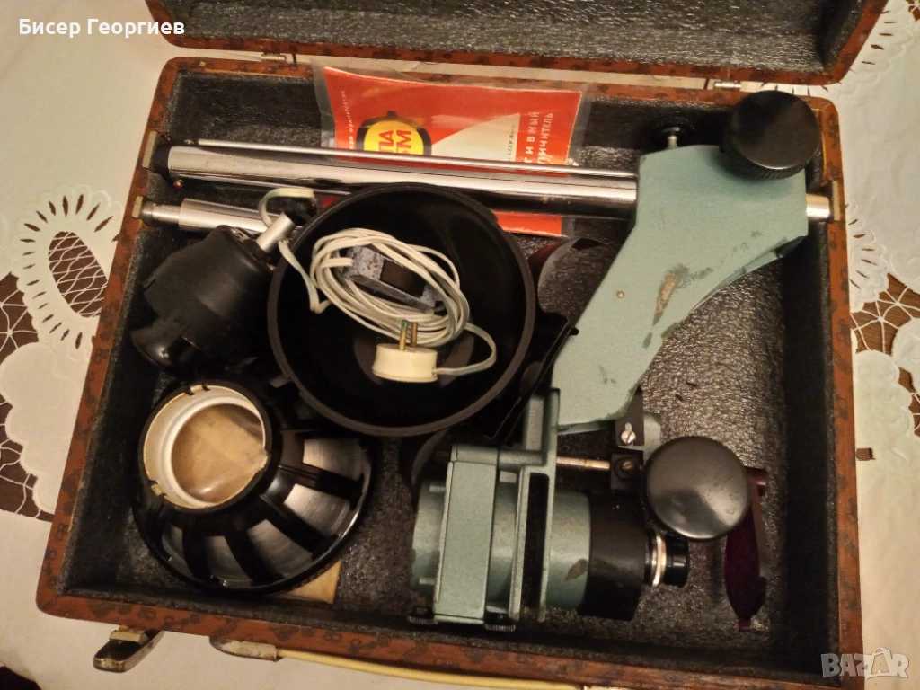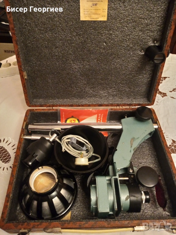 Продавам фотоувеличител ( фотокопирен апарат ) УПА - 5 М - нов ( неизползван ) . Едно време като малък се занимавах с фотография - и ми трябваше ... Но на един рожден ден ми подариха 2 и единия ( този ) никога не е използван . Всичко е оригинално (както се продава) плюс резервните неща . Има и касова бележка. Единственото неоргинално е тапицерията от вътрешната страна на куфарчето . Оригинално е изпълнена с дунапрен , който от престоя се беше разпаднал и едвам изчистих апарата и кутията от него . Подменил съм го със синтетичен . Апарата е сглобен за първи път сега - за снимка . Всичко е отлично запазено за годините си ! Имам и комбинирана фотографска гилотина (право и къдраво рязане) - нова , 3 щипки - нови , 2 ванички - нови , които при интерес продавам отделно . Имам и половин кутия фотографска хартия , която подарявам с фотоувеличителя ( но предполагам , че е воалирала вече ...