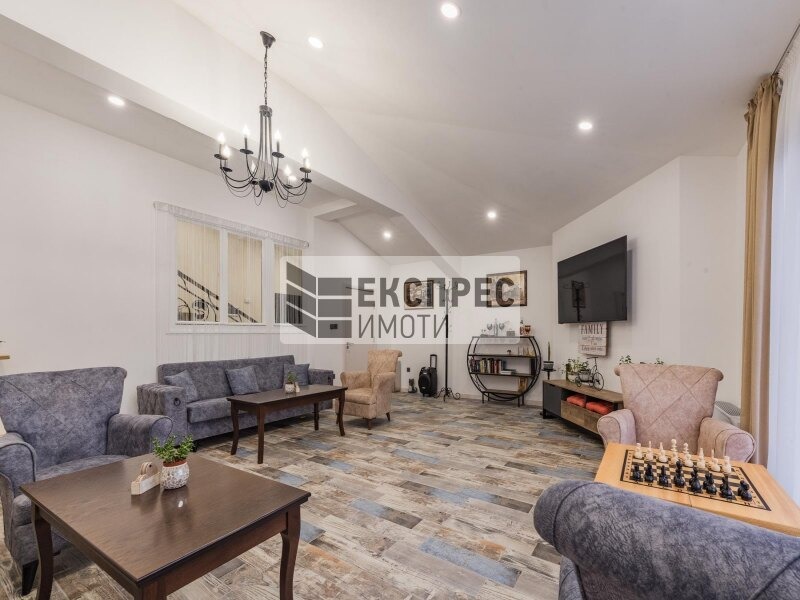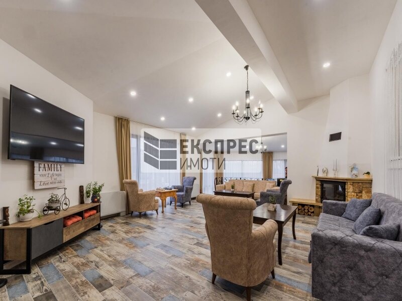 Общо 5 санитарни помещения.Голяма лятна кухня,гараж и голям прекрасно озеленен двор с много забавления за деца и възрастни.