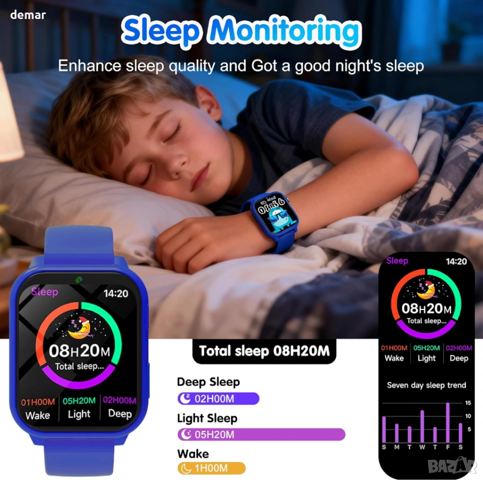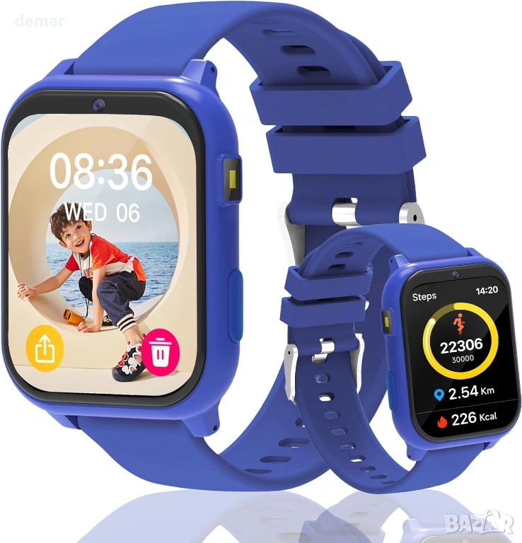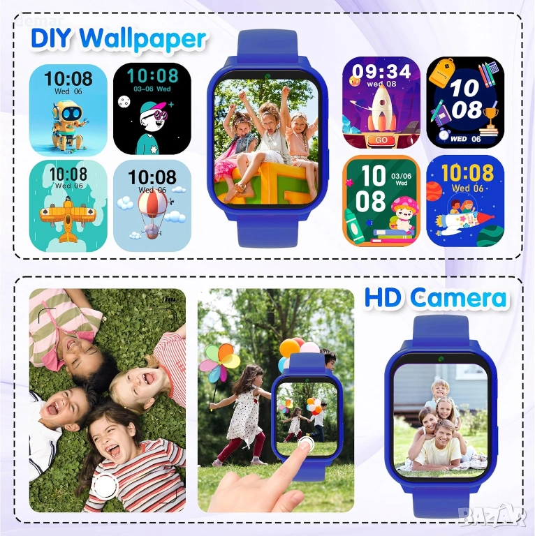 калкулатор, календар и хронометър. Часовникът включва също камера за заснемане на моменти, персонализируеми циферблати с DIY тапети и ясен сензорен дисплей за лесна употреба. С наблюдение на съня за насърчаване на по-здравословни навици и издръжлив, подходящ за деца дизайн с надежден живот на батерията, той предлага балансирана комбинация от забавление и функционалност, като същевременно намалява зависимостта от смартфони, което го прави обмислен и ангажиращ вариант за подарък за деца.