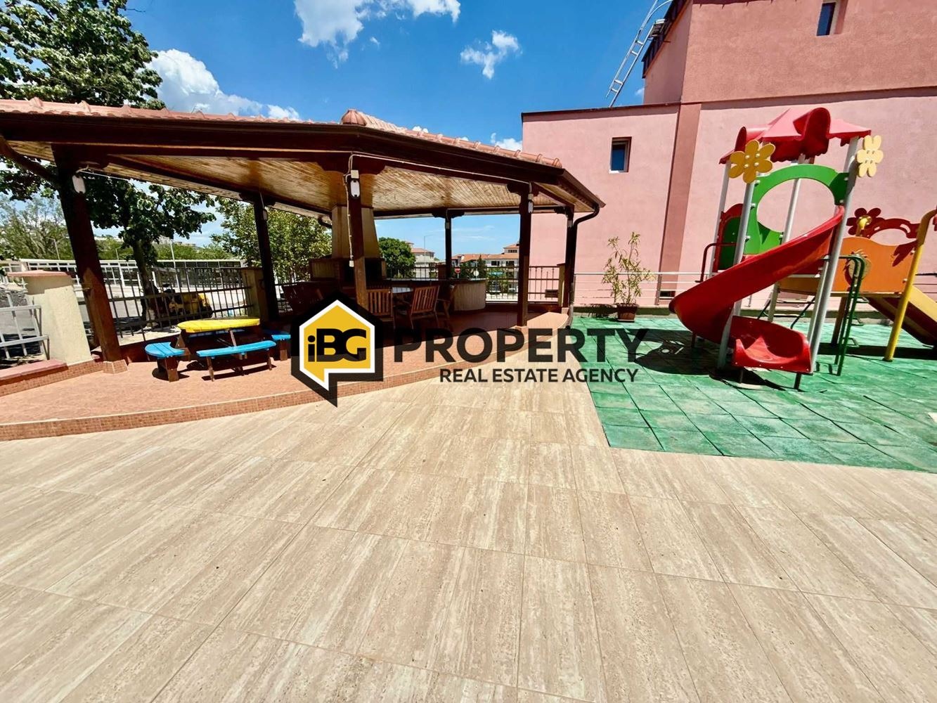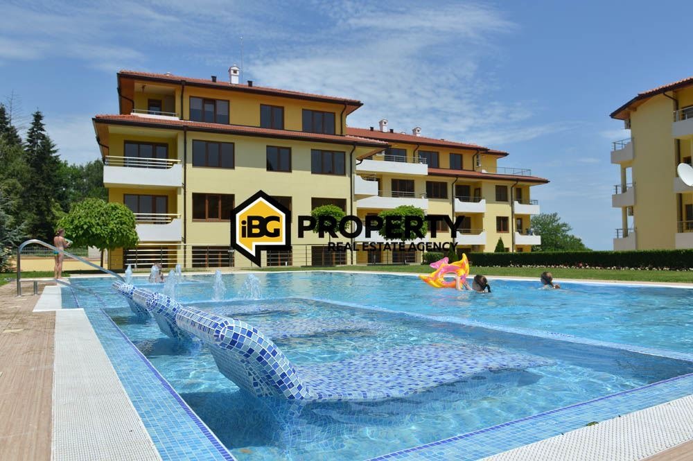 Територията на комплекса е изключително просторна, добре поддържана и богато озеленена, с няколко барбекю зони, релакс зони, детски площадки, детски басейни, детски кътове и като цяло 3 басейна. Към сградата има място да се паркира, отделно има фитнес площадка и детска площадка.
