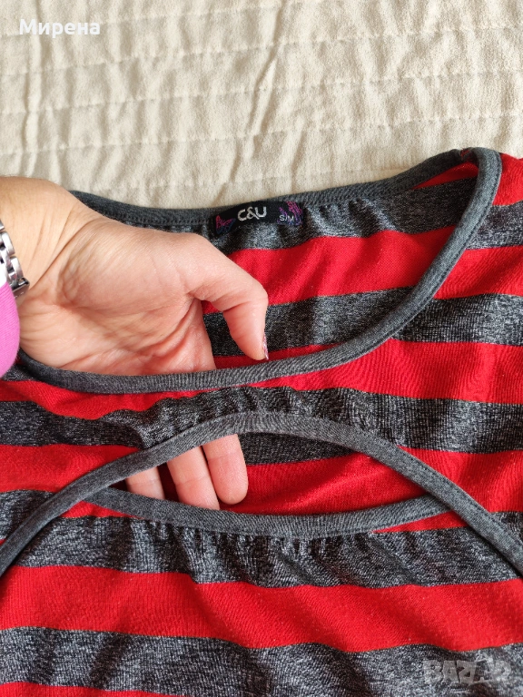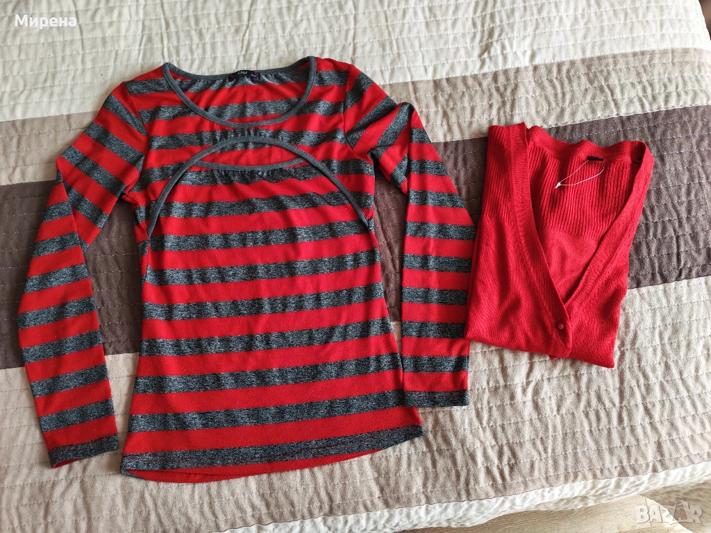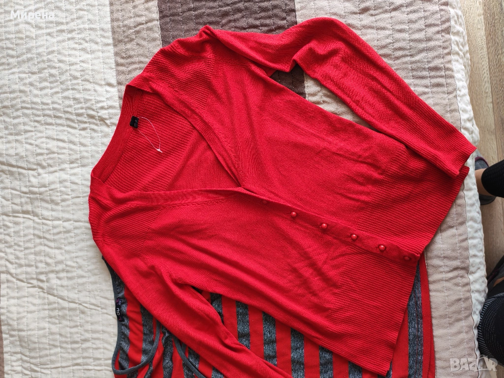 Комплект блуза на червено-сиво райе с отвор на деколтето, заедно с червена жилетка с копчета, която е само със свален етикет, необличана. Размера е S-M.