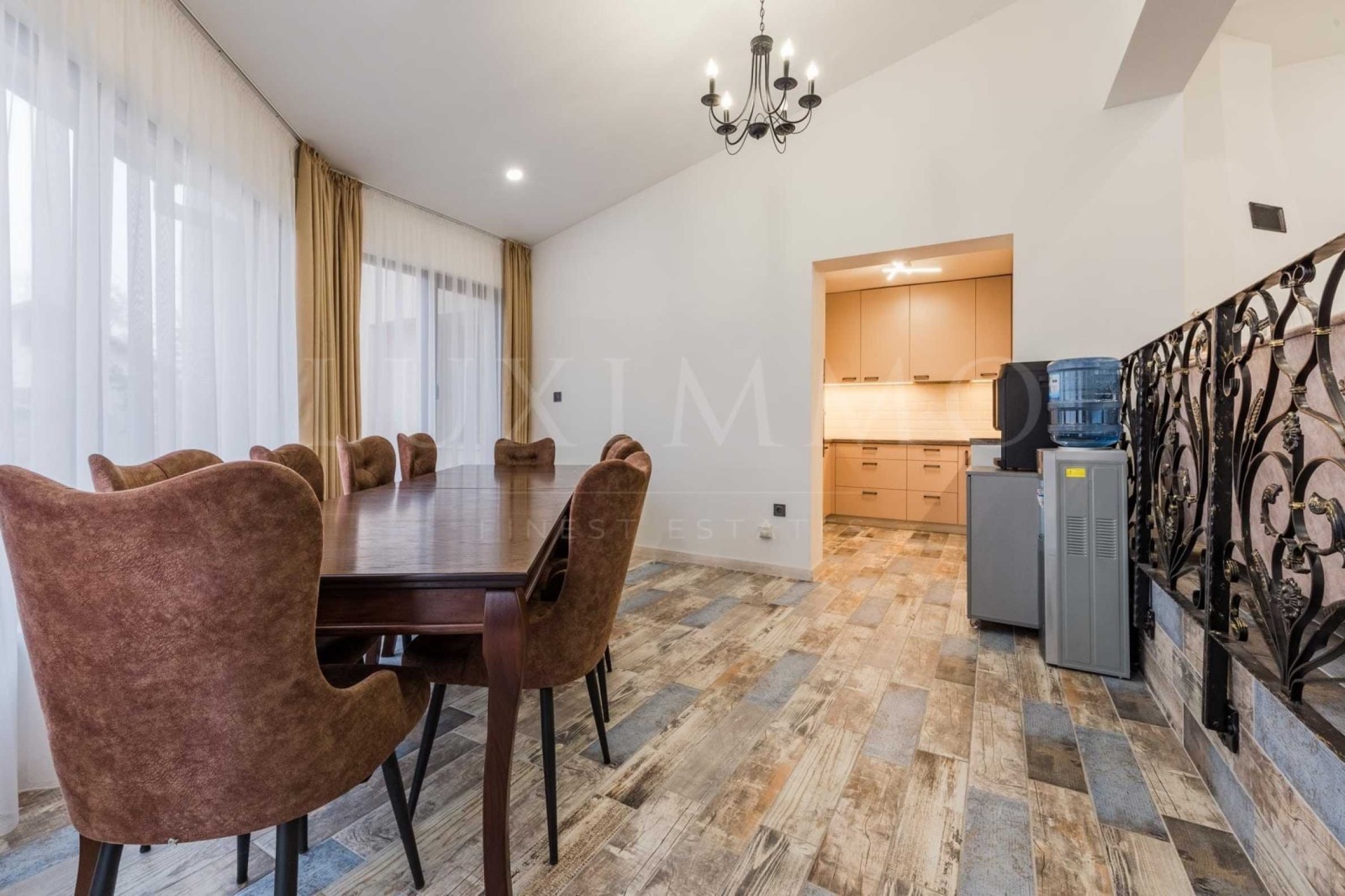 първи етаж просторна дневна с кътове за отдих и тихи игри, кухня, трапезария за до 12 човека и три спални помещения;