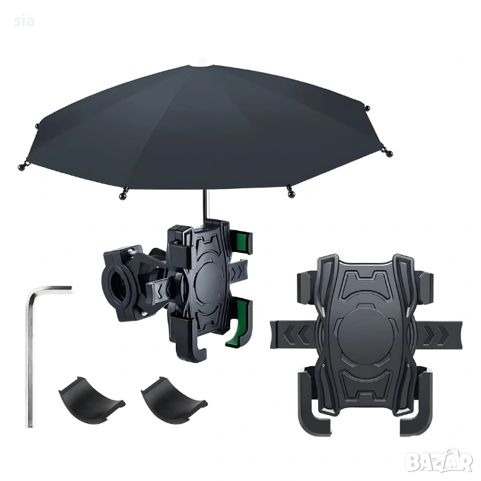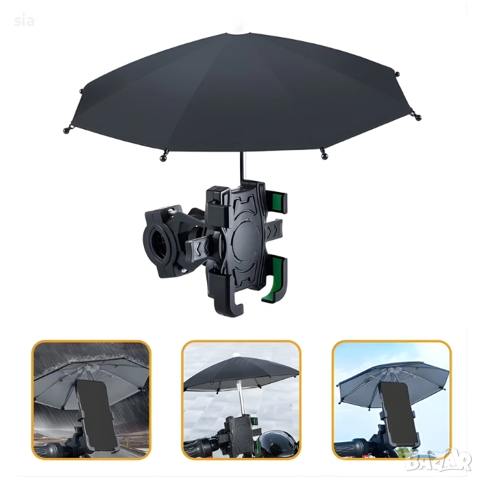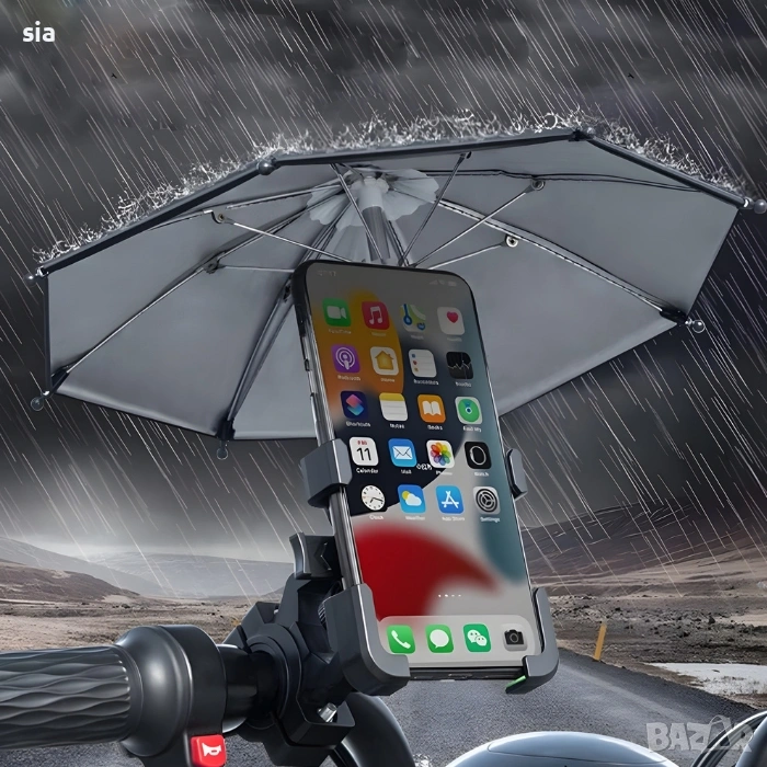 Този модел съчетава стабилно захващане и защита от атмосферни условия, като осигурява сигурно позициониране на вашия смартфон дори при неравни терени. Вграденото чадърче предпазва устройството от дъжд, силно слънце и отблясъци, което го прави изключително подходящо за всякакви условия.