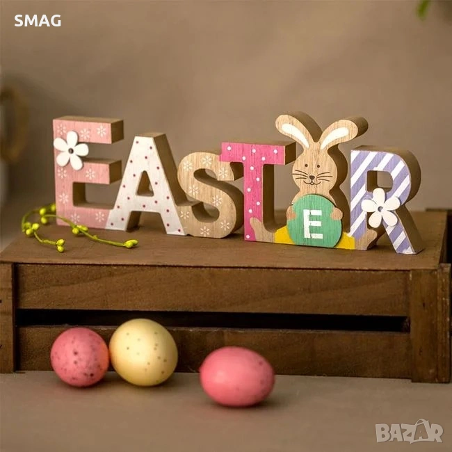 Великденска дървена настолна декоративна табела с надпис "EASTER", украсена със зайче и бели цветя. Прекрасен избор за празнична украса, която ще внесе топлина и пролетно настроение във всеки дом.