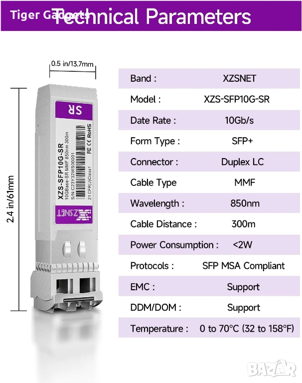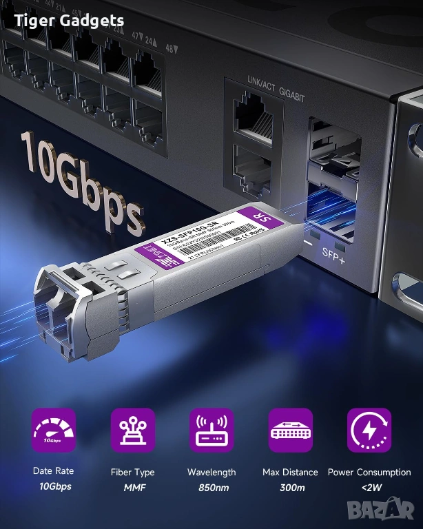 Модулът работи със скорост до 10Gbps и използва 850nm лазер, като поддържа разстояние до около 300 метра с OM3/OM4 оптичен кабел . Това го прави идеален за дата центрове, сървърни помещения и корпоративни мрежи.
