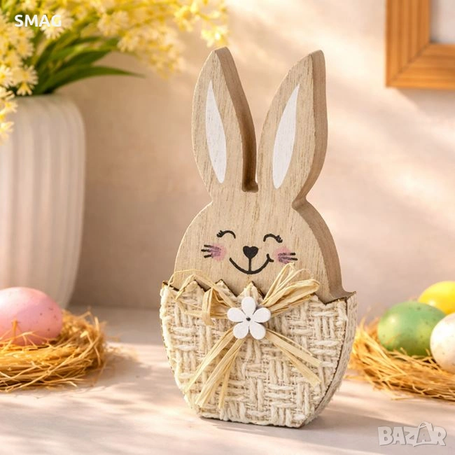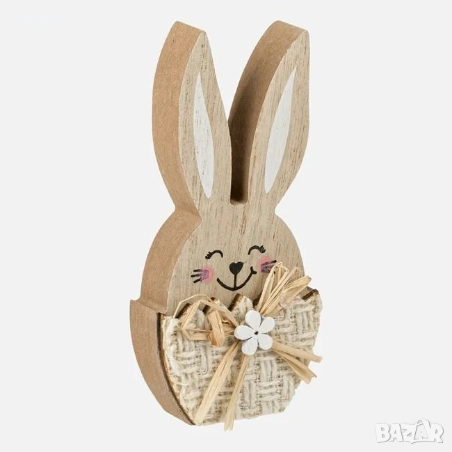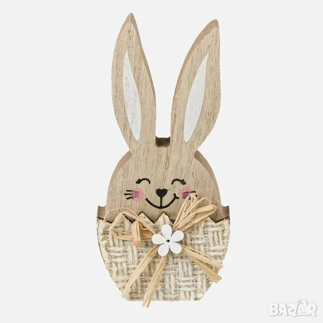 Великденска декорация представляваща дървено зайче в екрю бяло платнено яйце, допълнено с панделка и бяла маргаритка. Украсете всяко кътче в дома си с тази уникална великденска декорация.