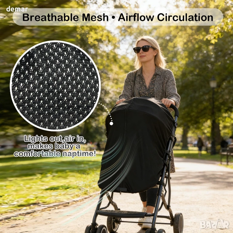 Осигурява UPF50+ защита, блокирайки до 99% от UV лъчите, като същевременно действа като дишаща бариера срещу насекоми, вятър и лек дъжд, създавайки спокойна среда за непрекъснати дрямки в движение. Двуслойният мрежест дизайн насърчава постоянен въздушен поток, за да поддържа бебетата хладни и удобни, без да ограничава видимостта и да намалява усещането за затвореност. Практичният отвор с цип позволява бърз достъп за проверка или поставяне на бебето вътре с минимални усилия. Изработена от издръжлив, устойчив на петна материал с машинно пране и бързосъхнещо покритие, тя е създадена за редовна употреба. Еластичната материя и сигурните велкро ленти осигуряват бърз монтаж и стабилно, универсално прилягане за повечето стандартни колички.