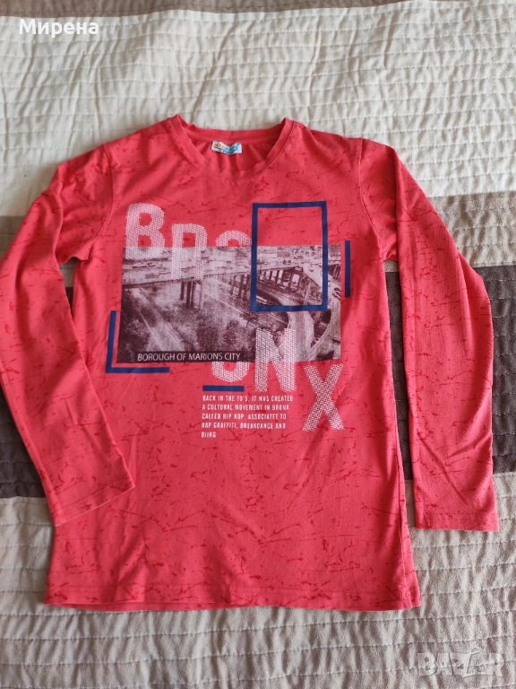 Блузката е обличана е точно веднъж, изпрана и прибрана, от памучно трико, без забележки по щампата и цвета.
