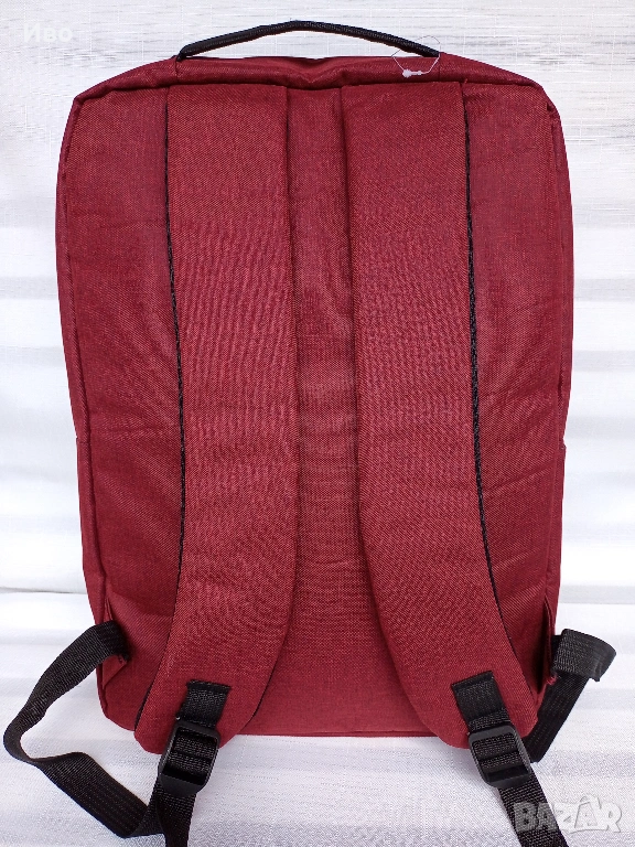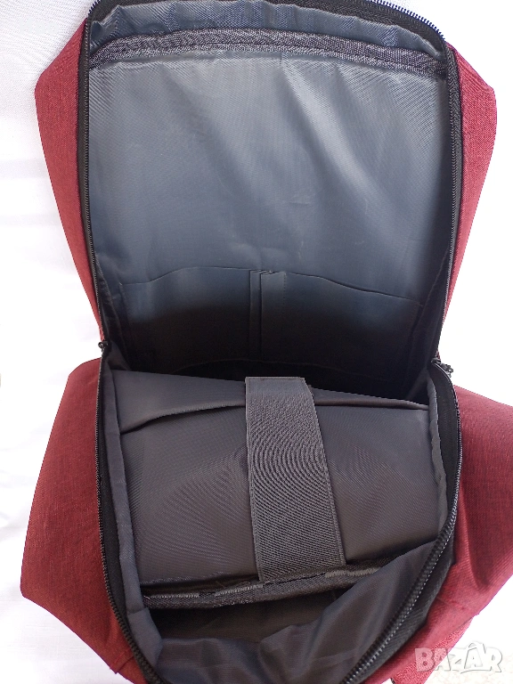 Отделение за лаптоп с широчина 26-27 см. Два предни джоба с цип. Един