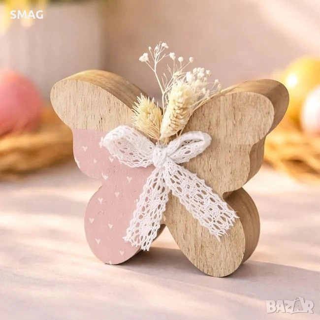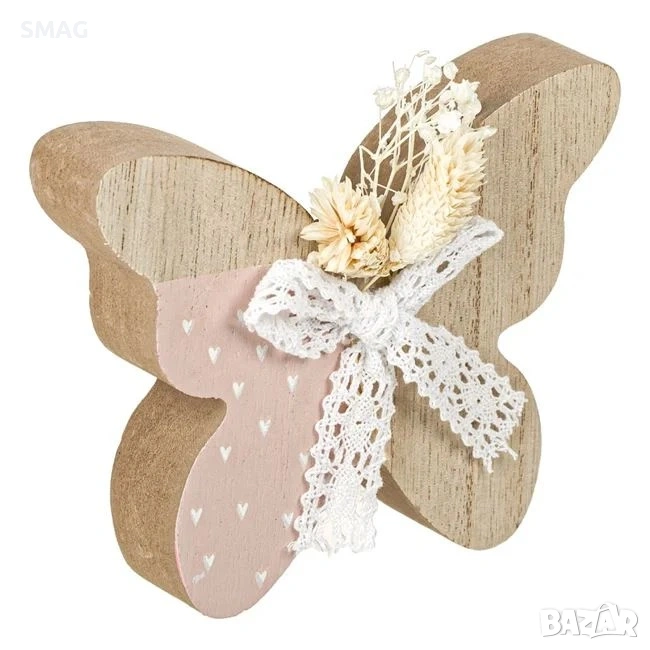 Великденска дървена декорация представляваща изящна пеперуда с бяла дантелена панделка и сухи цветя в цвят екрю. Декорацията е допълнена с детайли в цвят сьомга отляво и бели сърца на точки. Идеална за украсяване на всяко кътче в дома с уникална великденска и пролетна украса.