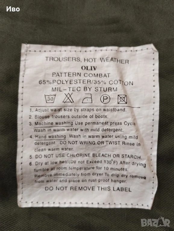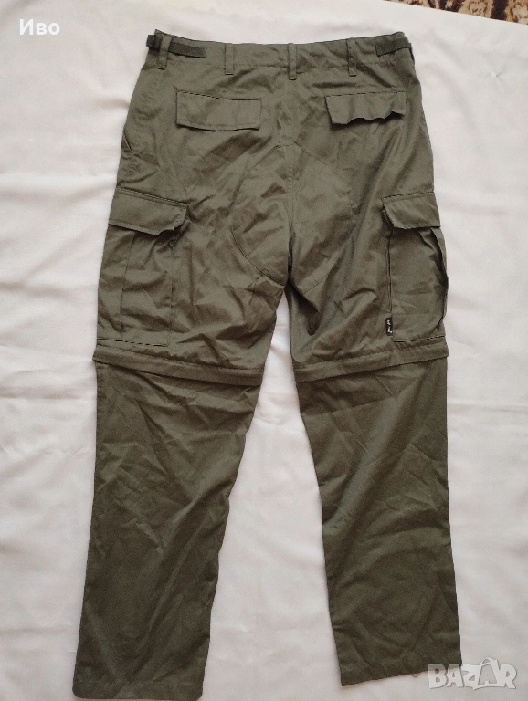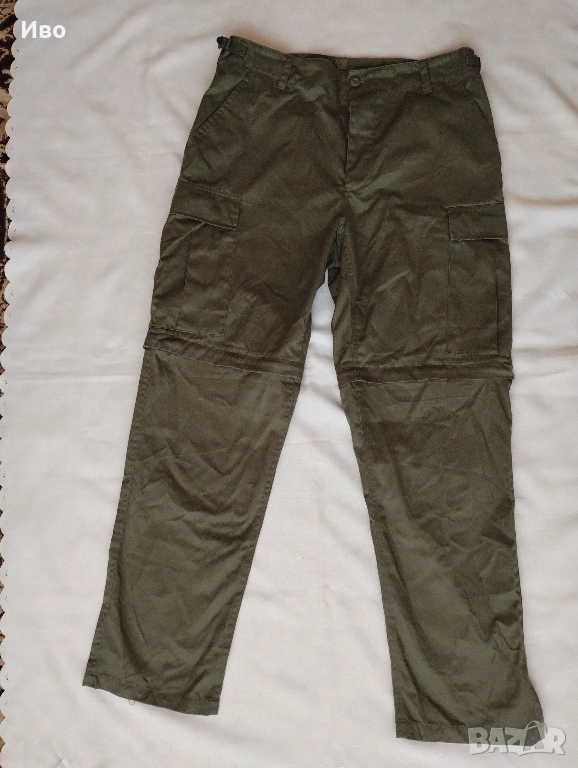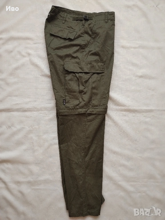 Mil Tec 2 в 1 панталон, размер L. В отлично състояние. Свалящи се крачоли. Когато са бермуди дължина 56 см. Регулируема талия. Два предни джоба, два задни с копчета. Цвят olive. Два големи карго джоба с копчета отстрани. 65 % полиестер, 35 % памук. Талия - 94 см. Дължина панталон 109 см. Връзки за маншети в долната част на крачола.
