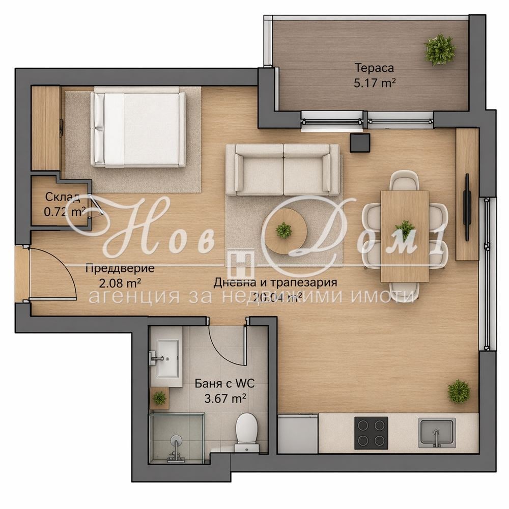 -слънчева Дневна с обособен Кухн. Бокс с достъп на тераса