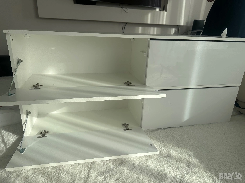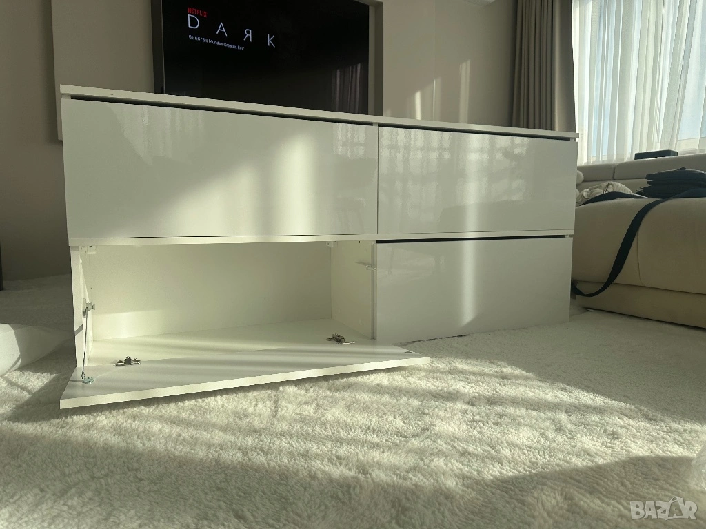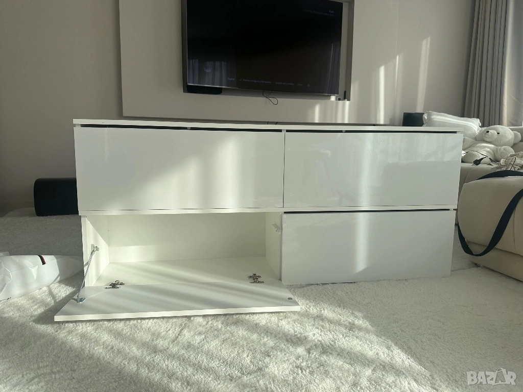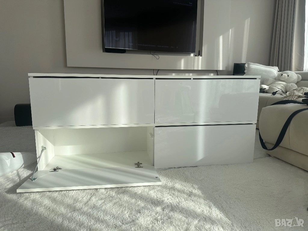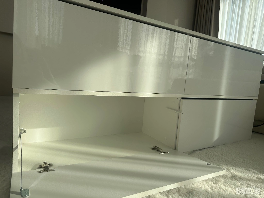 Тв шкаф , бял с бял лак, с пуш бутон → Обява 54225360