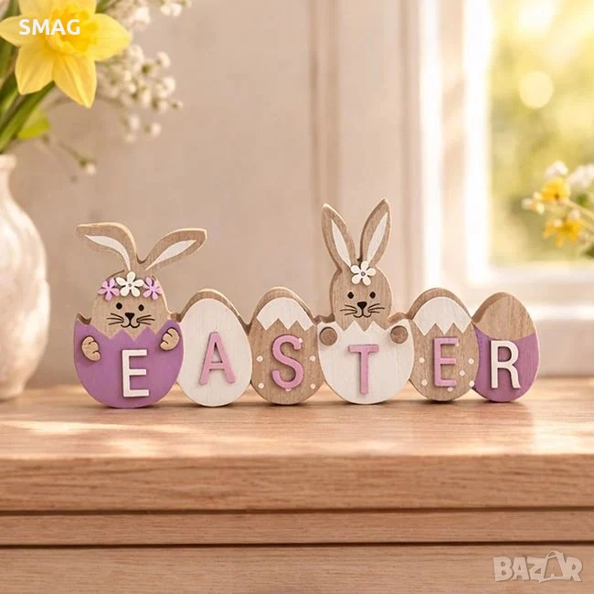 Великденска дървена настолна декоративна табелка с надпис „Easter", декорирана със зайчета и яйца в лилаво и бяло. Декорирайте всеки кът на дома си с уникални великденски и пролетни украси и създайте празнично настроение!