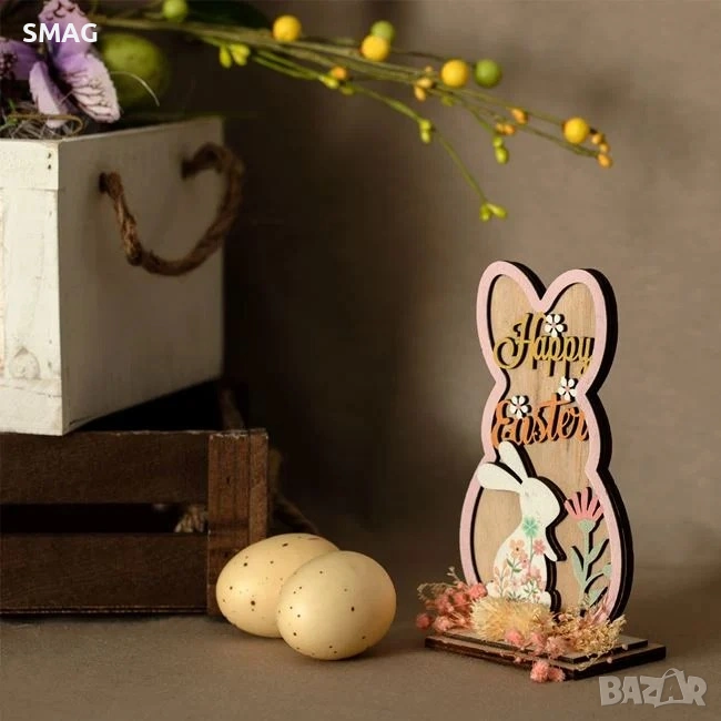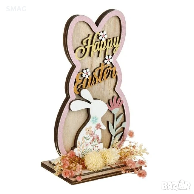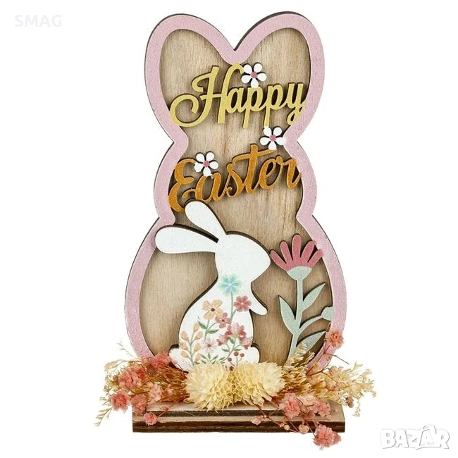 Великденска дървена настолна декорация – зайче с изсушени цветя и надпис „Happy Easter". Декорирайте всеки кът на дома си с уникални великденски пролетни украси и създайте празнично настроение!