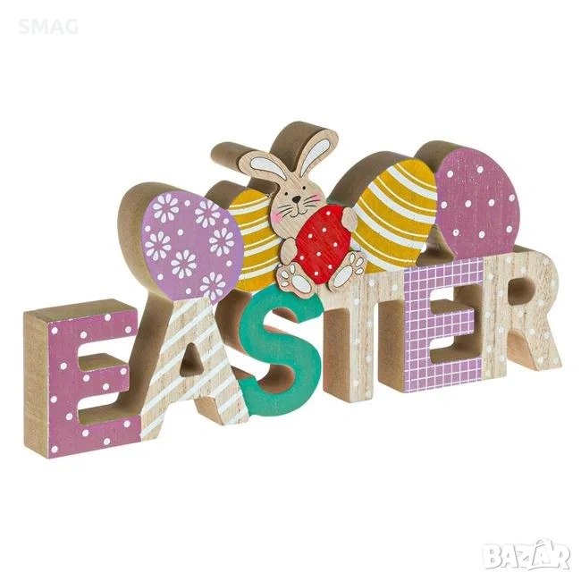Великденска настолна дървена декоративна табела с надпис „Easter", заек и цветни яйца. Декорирайте всяко ъгълче на дома си с уникални великденски и пролетни украшения.