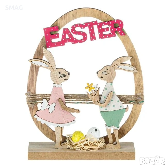 Великденска дървена декорация под формата на яйце с две зайчета в гнездо с яйца и надпис "Easter". Тази уникална великденска украса ще допълни прекрасно всяко кътче на дома ви с празнична, пролетна атмосфера.