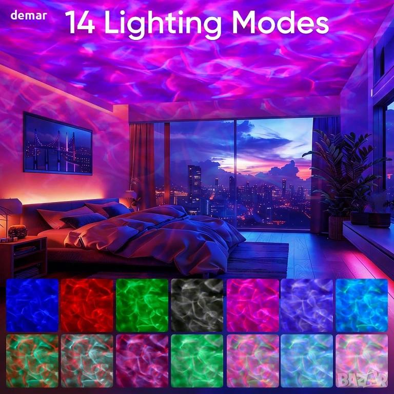 Този проектор с океански вълни създава завладяващо околно осветление с 14 динамични цветови режима, които симулират течащи водни ефекти по стени и тавани, идеални за релаксация, сън или подобряване на естетиката на стаята. Разполага с сензорно и дистанционно управление за лесно регулиране на цветовете, яркостта, скоростта и настройките на таймера. Проектиран с 360° ъгъл на прожектиране и регулируема стойка, той осигурява покритие на цялото помещение в различни настройки. Светлината включва 8 нива на яркост и 4 скорости на въртене, за да отговаря на различни настроения, от успокояваща нощна светлина до по-жива среда. Таймерът за автоматично изключване добавя удобство и енергийна ефективност, а универсалният му дизайн го прави подходящ за спални, детски стаи, игрови конфигурации или общ домашен декор.