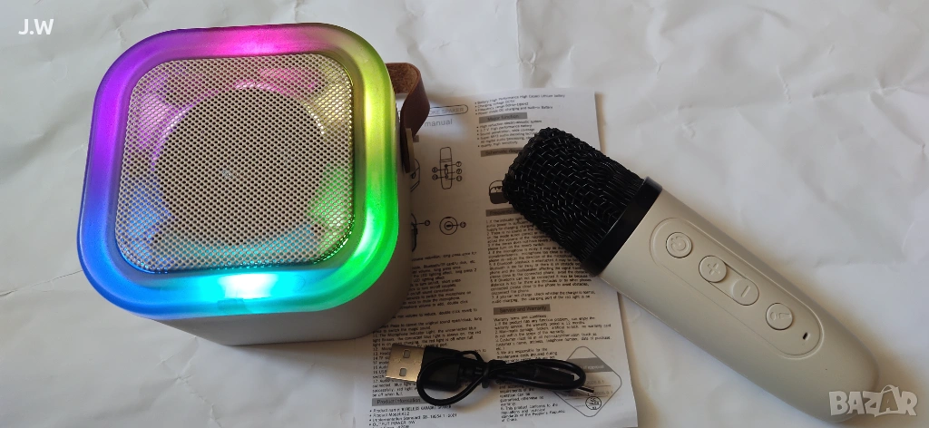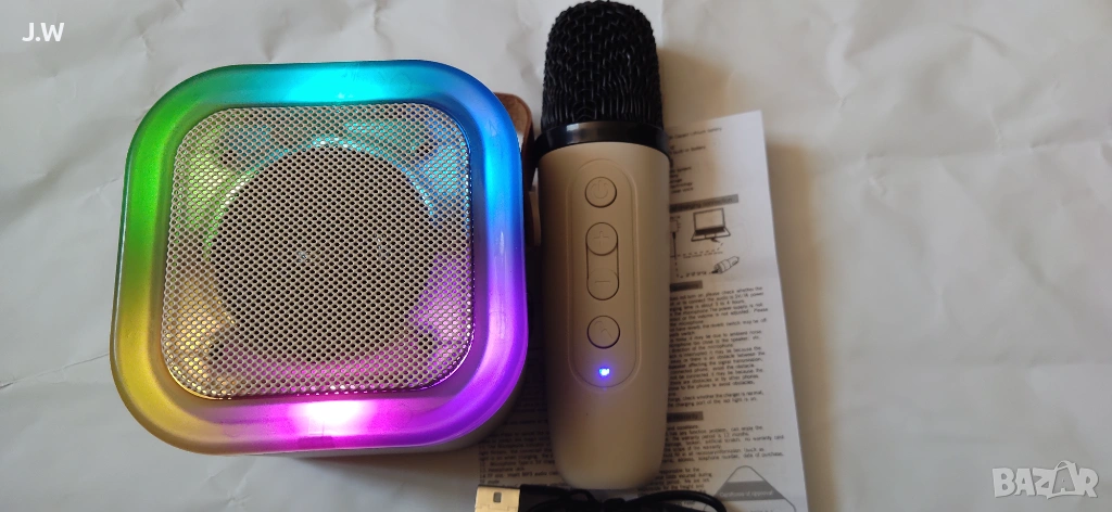 Високоговорител, безжичен микрофон, караоке система и цветна светлинна атмосфера в едно.