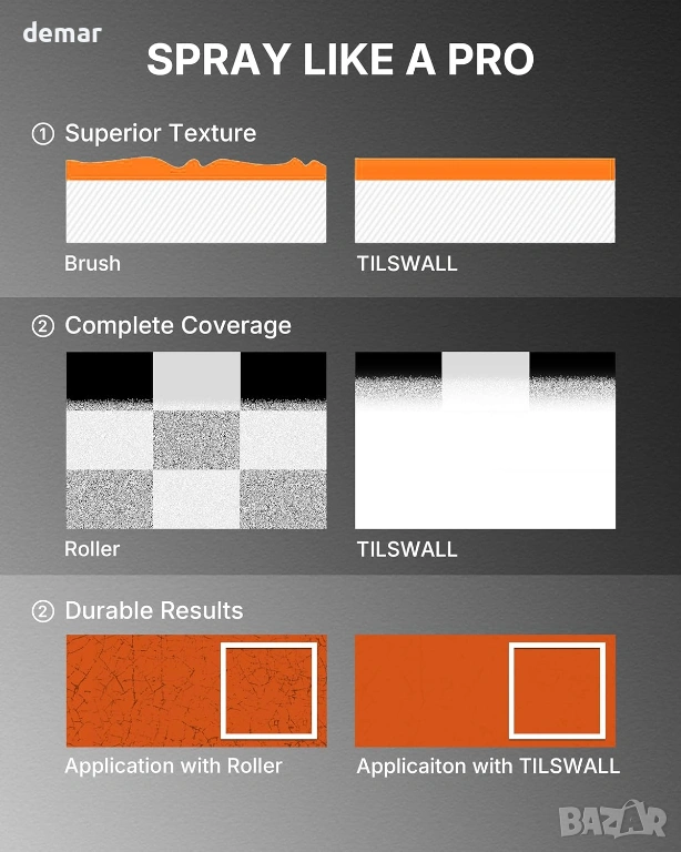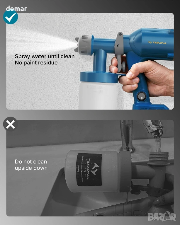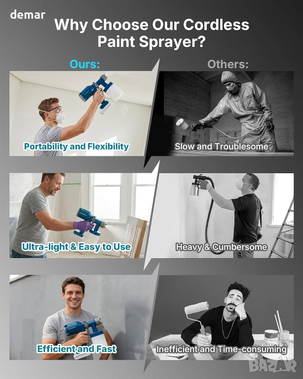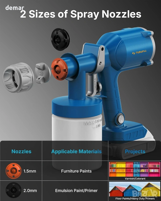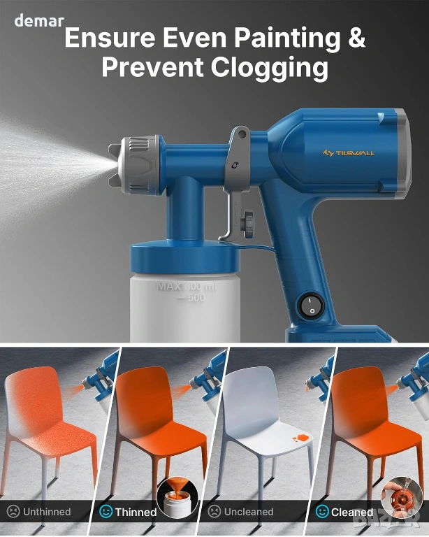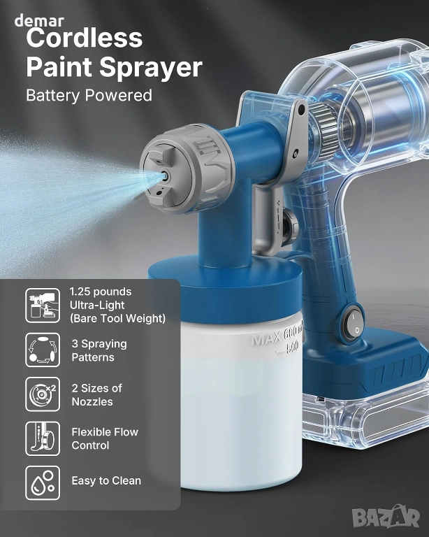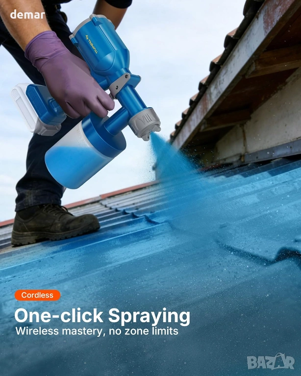Безжична бояджийска пръскачка, проектирана за гъвкава употреба на закрито и открито, съвместима с батерии Dewalt 18V/20V за неограничено движение без кабели; разполага с лека ергономична конструкция, използваща издръжлив аерокосмически полимер за удобна продължителна употреба, заедно с безинструментален щракващ монтаж за бърза настройка, почистване и съхранение; осигурява гладко и равномерно покритие с регулируем контрол на потока за прецизно нанасяне при различни задачи и включва множество режими на пръскане и сменяеми дюзи за справяне с широк спектър от проекти - от детайлна работа с мебели до боядисване на големи повърхности като стени, огради и тераси.