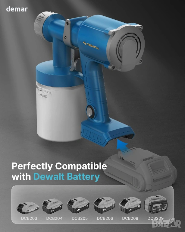 Преносим бояджийски пистолет Tilswall за Dewalt 18V/20V батерия, 600 мл, без батерия