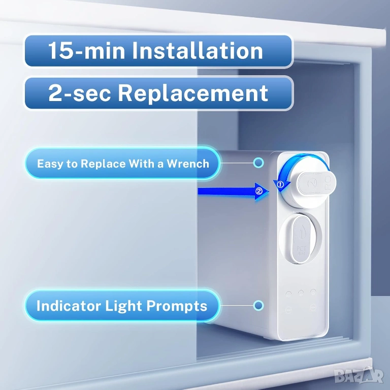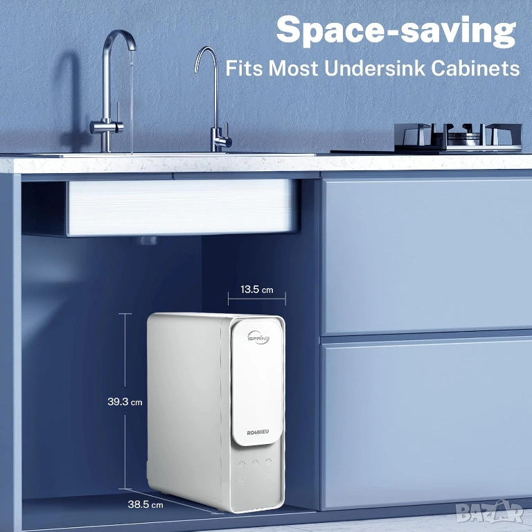 - С технологията „всичко в едно“ за водопровод, системата за филтриране на вода с обратна осмоза е лесна за самостоятелно инсталиране. Може да се монтира под мивка, а безрезервоарният дизайн спестява до 70% място.