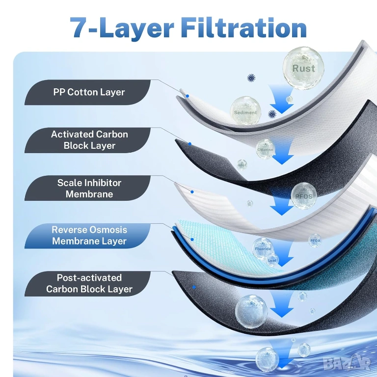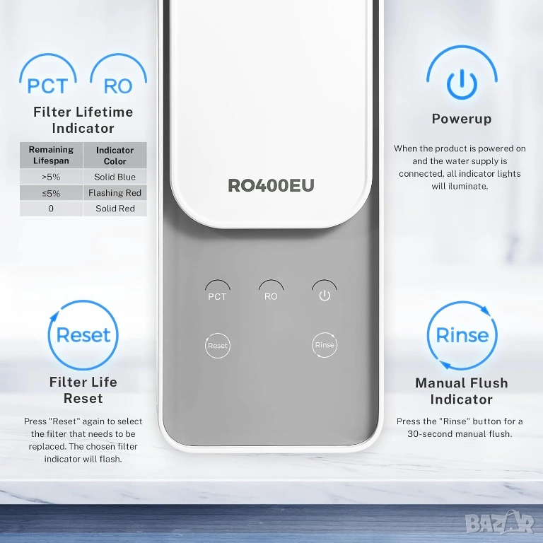 - Системата за филтриране на вода под мивка RO преобразува чешмяната вода в чиста питейна вода. 4 в 1 PCT филтърът премахва до 99% от над 1000 вредни примеси, като хлор, флуорид, олово (до 98%), арсен, азбест, калций, натрий, утайки, пясък, миризми и др. Степента на отстраняване на TDS е до 99%.