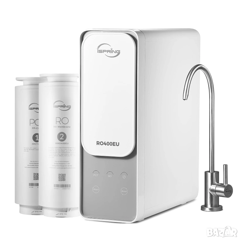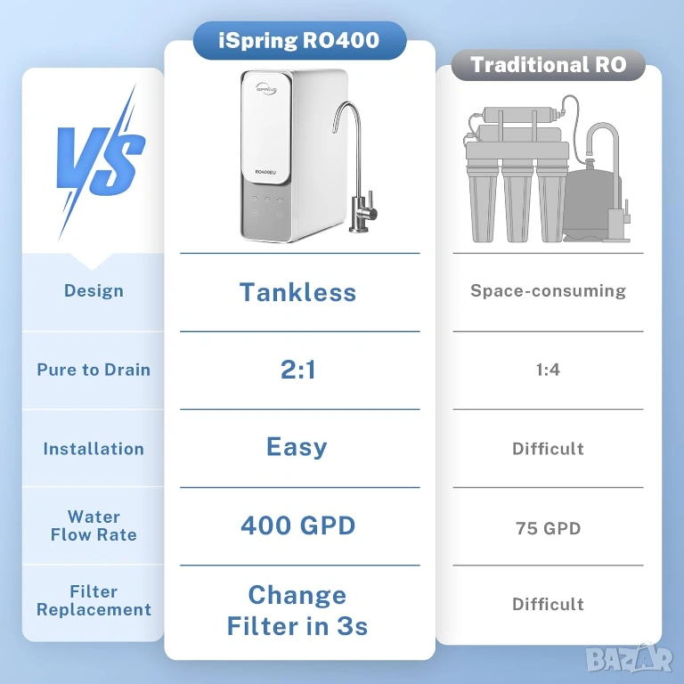 - Системата за филтриране на вода с обратна осмоза iSpring RO400 има съотношение на чиста отпадъчна вода 2:1, което е до 400% по-ефективно от традиционните RO системи под мивка. Безрезервоарните системи за обратна осмоза имат дебит до 0,4 GPM с минимални отпадъци, а RO системите за филтриране на вода изискват по-малко от 8,5 секунди, за да напълнят чаша вода (150ml).