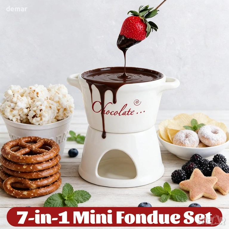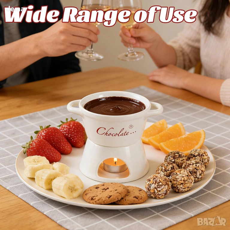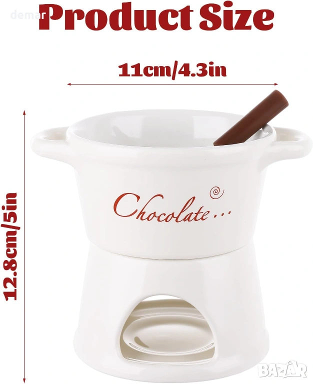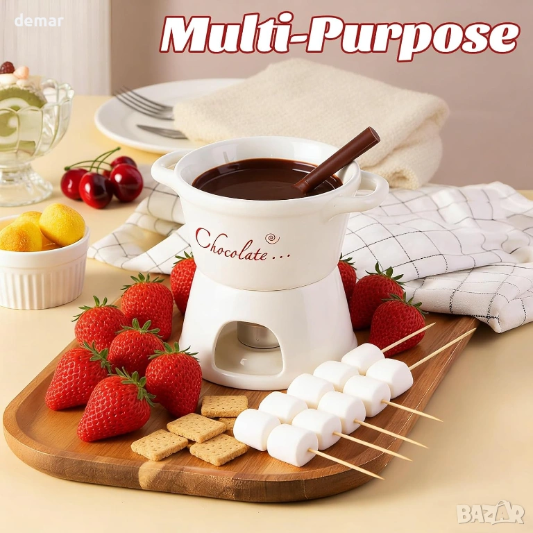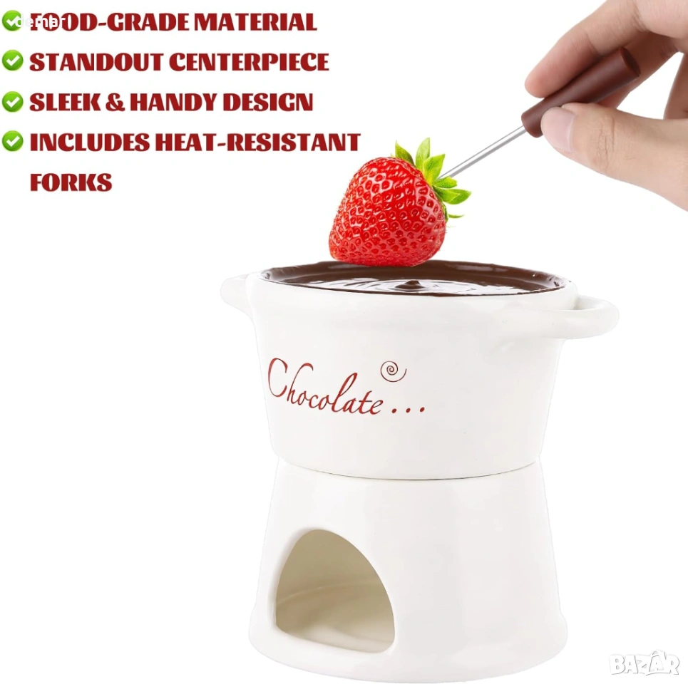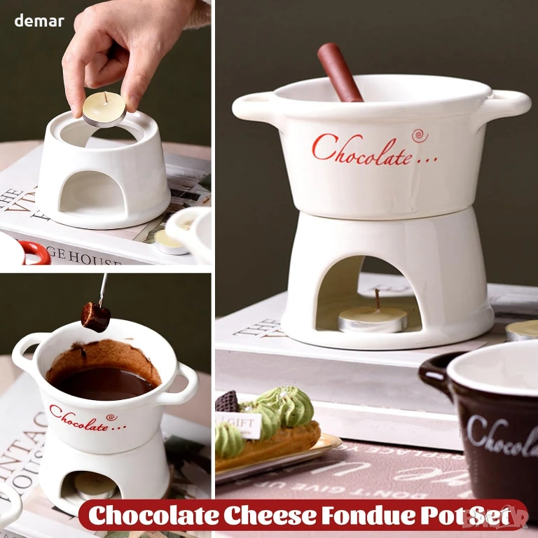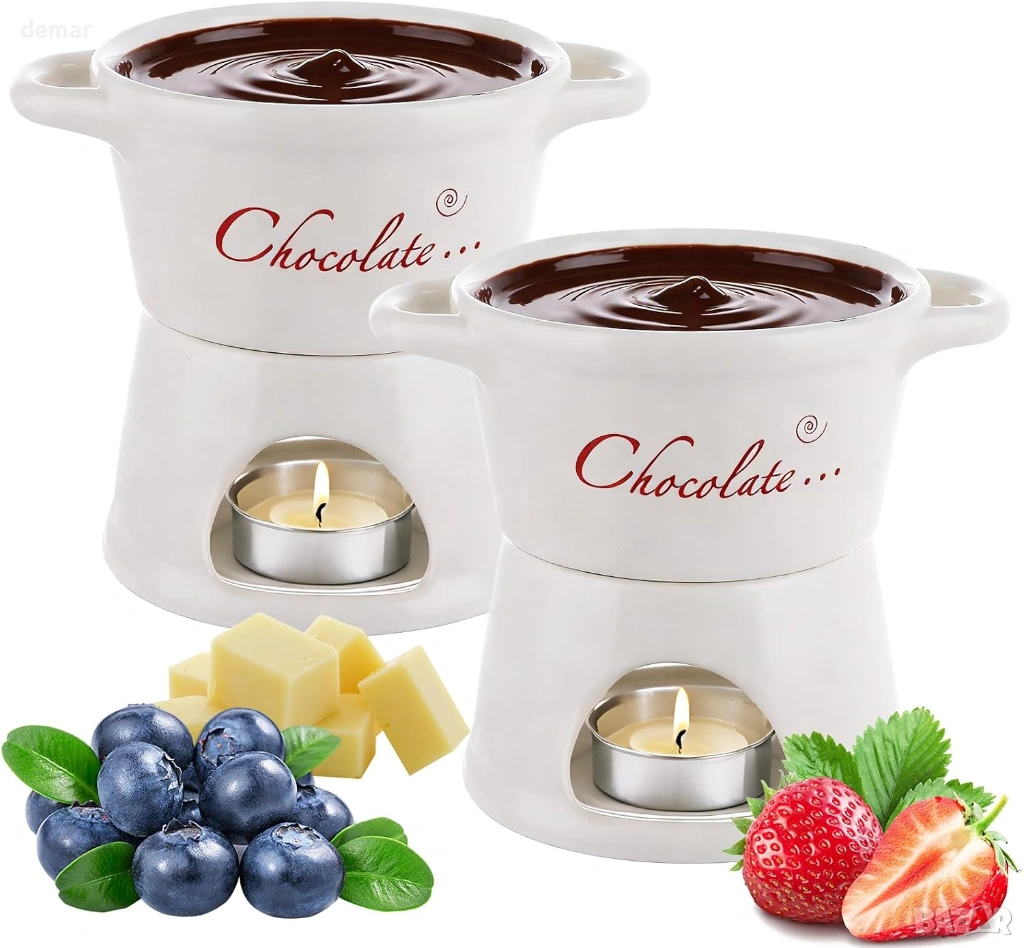 Този комплект от 2 части за шоколадово фондю е предназначен за двама души и включва керамични чаши, поставки за чаени свещички и вилици за потапяне, предлагайки уютно и интимно десертно изживяване. Изработен от висококачествена термоустойчива керамика, той осигурява равномерно затопляне, за да поддържа гладка консистенция на потапянето, като същевременно добавя изискан щрих към масата. Компактният му, пестящ място дизайн е лесен за работа и почистване, което го прави практичен за ежедневна употреба. Освен за шоколад, той може да се използва и за топене на сирене, затопляне на масло или сервиране на карамел, което го прави универсално допълнение към различни лакомства. Опакован в елегантна кутия, готова за подарък, той е подходящ за специални поводи като годишнини, сватби или новодомци.