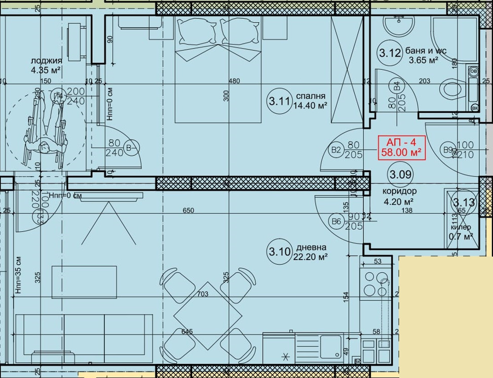 Имотът е с площ от 71м2, със следното разпределение: всекидневна с кухня, спалня, санитарен възел и лоджия.
