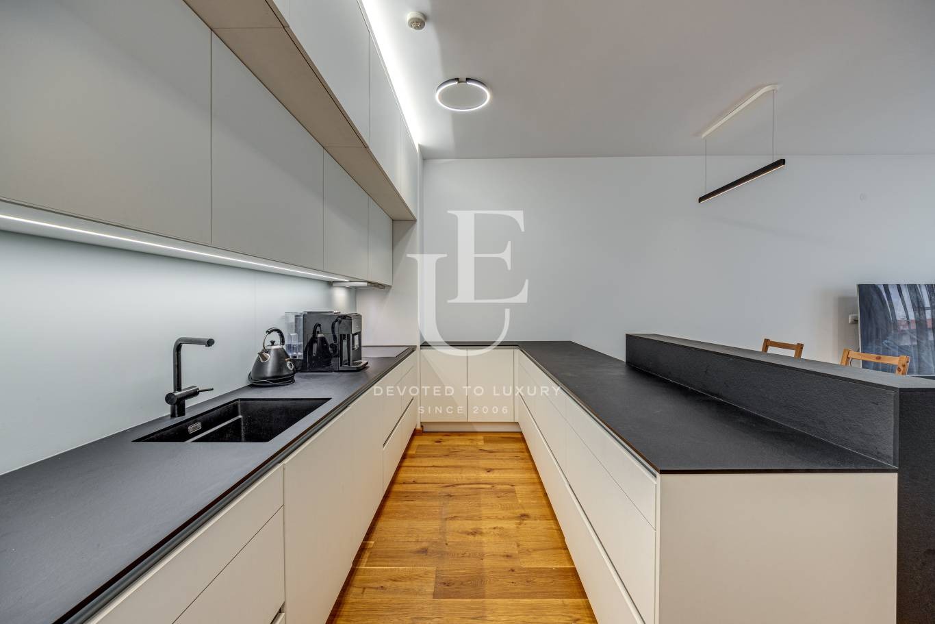 С обща застроена площ от 130 кв.м, жилището разполага с просторен хол с кухня (41,5 м2), една уютна спалня с дрешник (27 м2), отделен кабинет (15,7 м2), баня с тоалетна (6,5 м2), както и мокро помещение, оборудвано с пералня и сушилня. Кухнята е напълно оборудвана с всички необходими висок клас електроуреди.