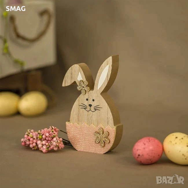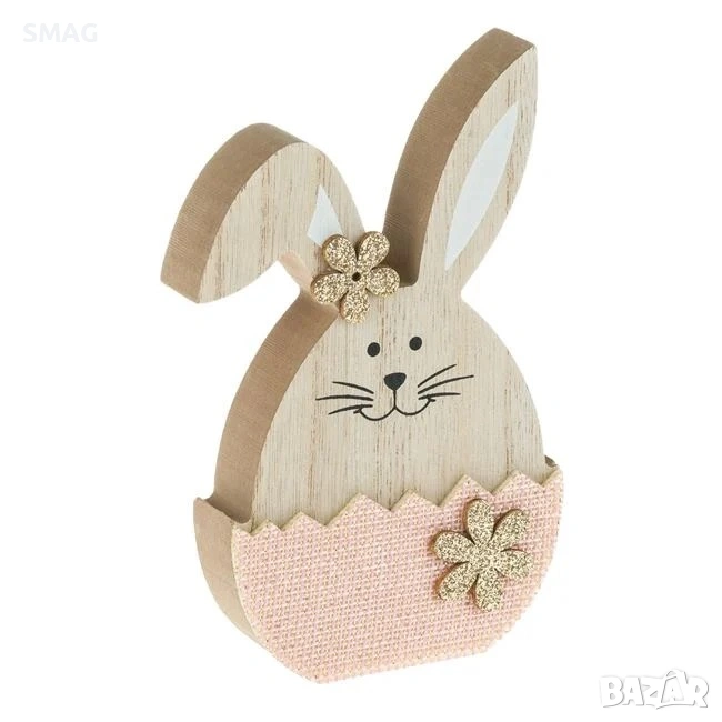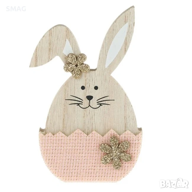 Великденска дървена декоративна фигурка представляваща зайче в розово яйце, украсено със златисти маргаритки. Перфектна за създаване на празнична атмосфера и украсяване на дома с уникална великденска и пролетна декорация.