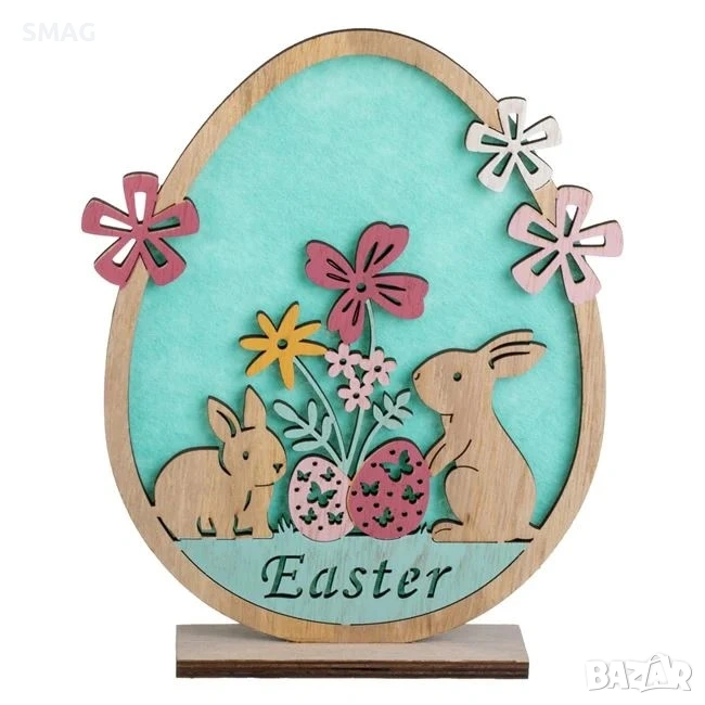 Великденска настолна декоративна фигурка под формата на яйце с филцов фон в цвят мента. Украсена е с очарователни зайчета, цветя и надпис „Easter", което я прави идеална за великденската декорация на вашия дом. Фигурката ще внесе свежест и празнично настроение в интериора ви през най-красивия сезон от годината.