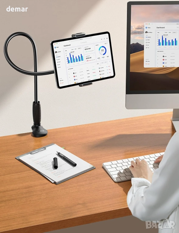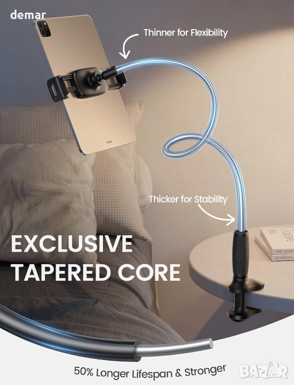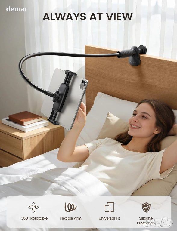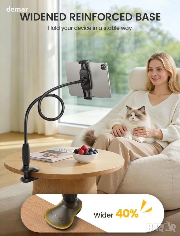 Тази подобрена поставка за таблет/смартфон е с издръжлива, конична алуминиева сърцевина с подсилена основа за подобрена стабилност и намалено трептене, а гъвкавата горна част позволява плавно и лесно регулиране. Тя поддържа устройства от 4,7 до 13 инча, включително таблети, електронни четци и смартфони, със сигурна скоба, подходяща за различни размери и калъфи. Дългото, огъващо се рамо, комбинирано с пълно завъртане на 360°, позволява удобно гледане от множество позиции, независимо дали сте в легнало, седнало или изправено положение. Здравата регулируема скоба за основа се закрепва здраво към широк спектър от повърхности, което я прави подходяща за употреба в леглото, на дивани, бюра или в кухнята и фитнеса. Проектирана с мисъл за ергономичност, тя помага за намаляване на напрежението във врата, а защитната подплата предотвратява надраскване и гарантира, че устройствата ще останат сигурно на мястото си.