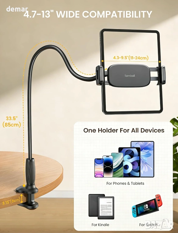 Стойка за таблет/смартфон Lamicall с 85 см гъвкава гъша шия за устройства 4,7-13"