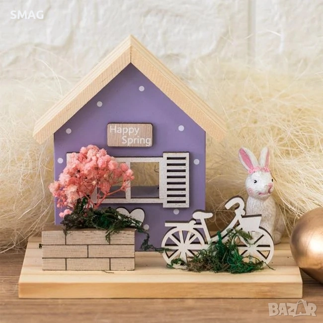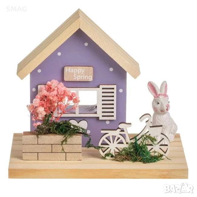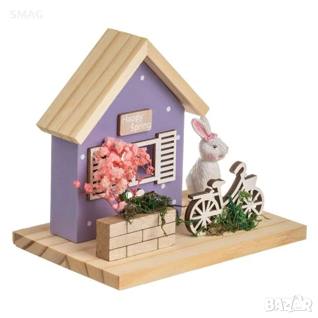 Великденска настолна дървена декоративна къща в лилаво-розови тонове с прозорец и бели щори. Декорацията включва зайче, велосипед и саксия с изсушени розови цветя. Къщичката е допълнена с дървена врата, дървена ограда и красива композиция от изсушени розови цветя, която създава уютна великденска атмосфера.