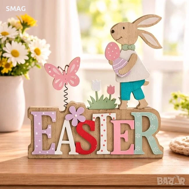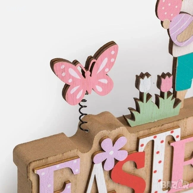 Дървена великденска декоративна табела "Easter" със зайче, цветя и пеперуда на пружина. Пролетен акцент в красиви цветове за уникална украса на дома.