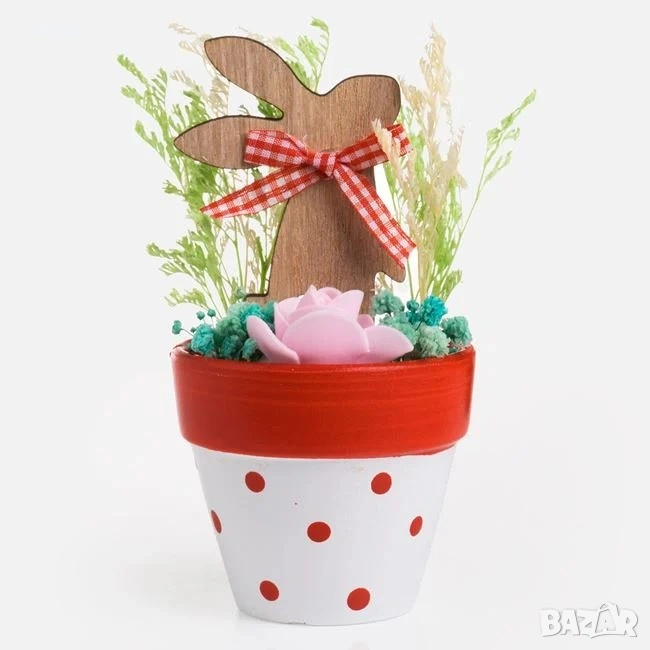 Великденска декоративна керамична саксия в червено на точки с дървена фигурка заек, украсена с червена карирана панделка и сухи цветни цветя. Прекрасен пролетен акцент в красиви цветове за уникална украса на дома.