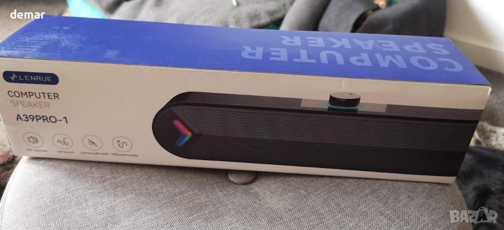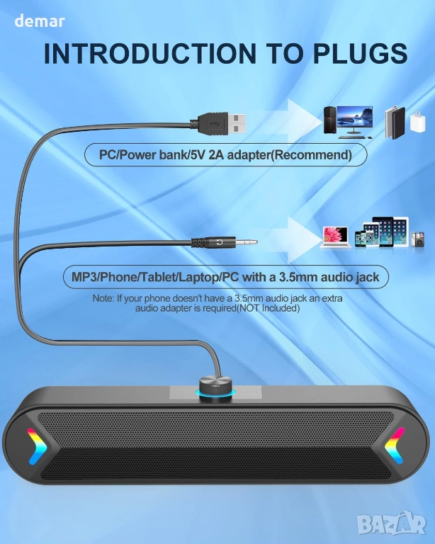 LENRUE 10W стерео компютърен саундбар с цветни светлини, 1,2 метра кабел, (черен-Aux)