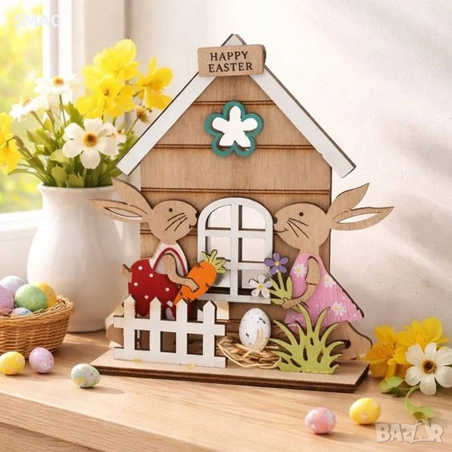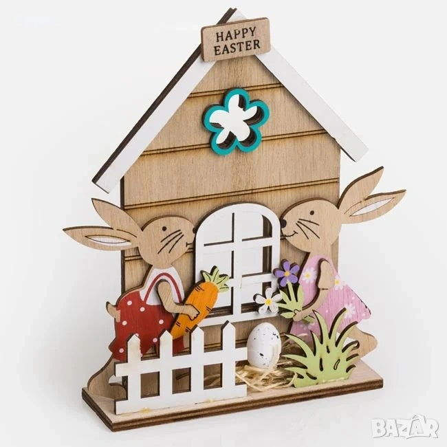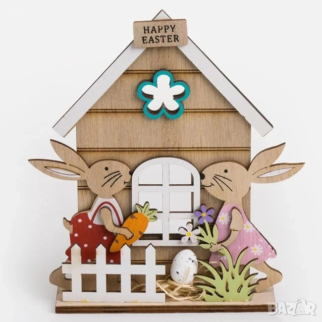 Дървена великденска декоративна къщичка с 2 фигури на зайци, ограда и яйчице, с послание "Happy Easter". Пролетен акцент в красиви цветове за уникално украсяване на дома ви.