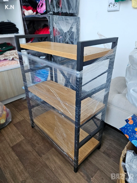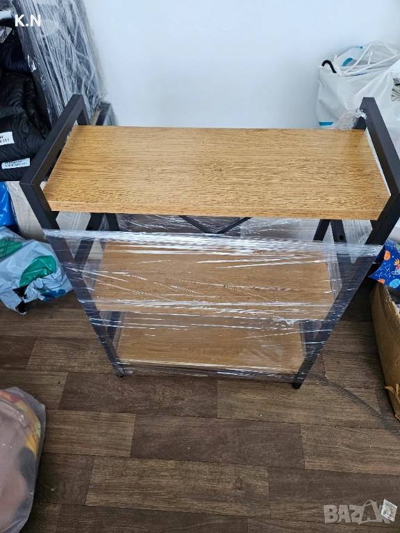Материал метал и дърво! Много лека и удобна етажерка. Използвана няколко месеца само.