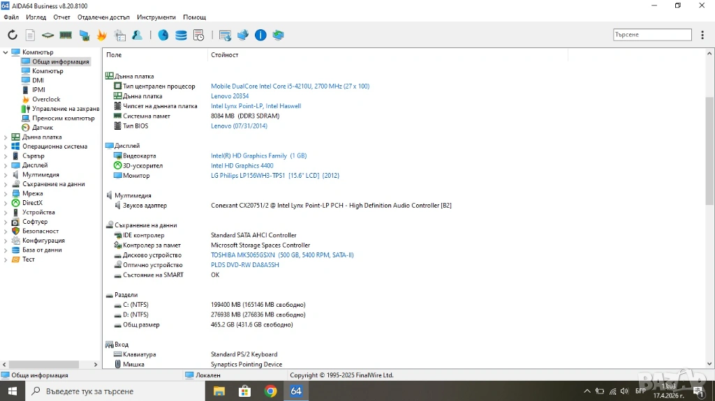 Интерфейси: 1x USB 3.0, 2x USB 2.0, VGA, HDMI, 5 в 1 четец за карти памет