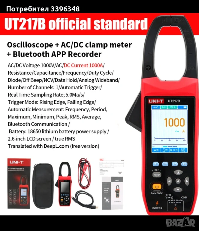 Нов UNI-T UT217A UT217B Осцилоскоп Мултиметър Клещи 1000V AC DC 1000A True RMS Bluetooth рекордер 18650 Литиева батерия NCV. Модел: UT217B