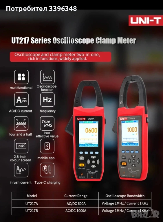Амперклещи UNI-T UT217A UT217B Осцилоскоп Мултиметър Клещи 1000V AC DC 1000A True RMS Bluetooth