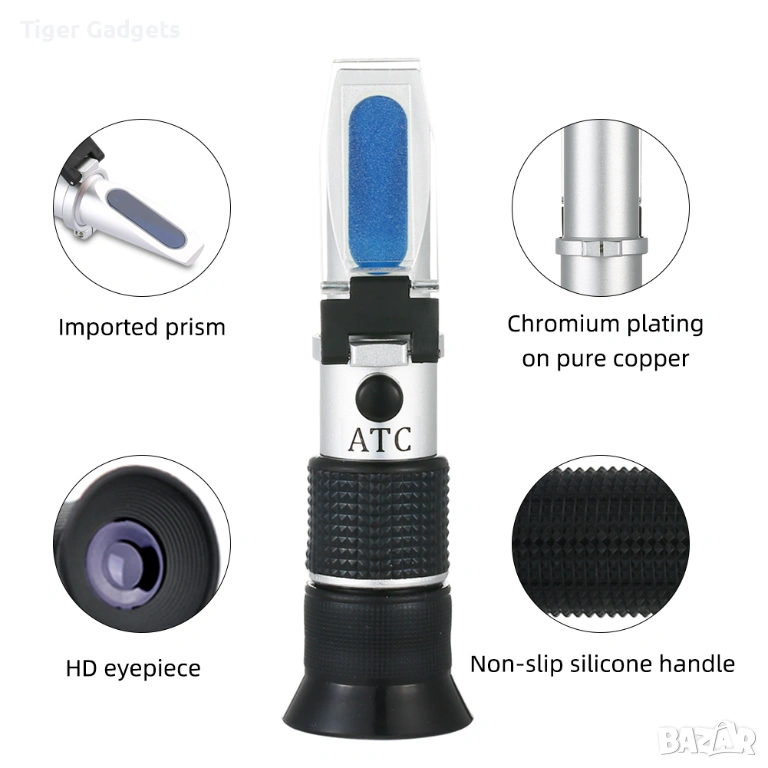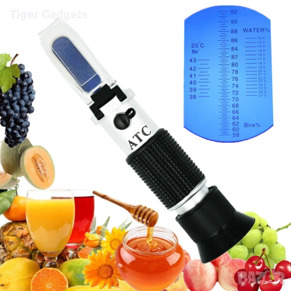Ръчен оптичен рефрактометър, предназначен за измерване на захарното съдържание (Brix) и влагата в мед, както и други високо захарни течности като сиропи и конфитюри.